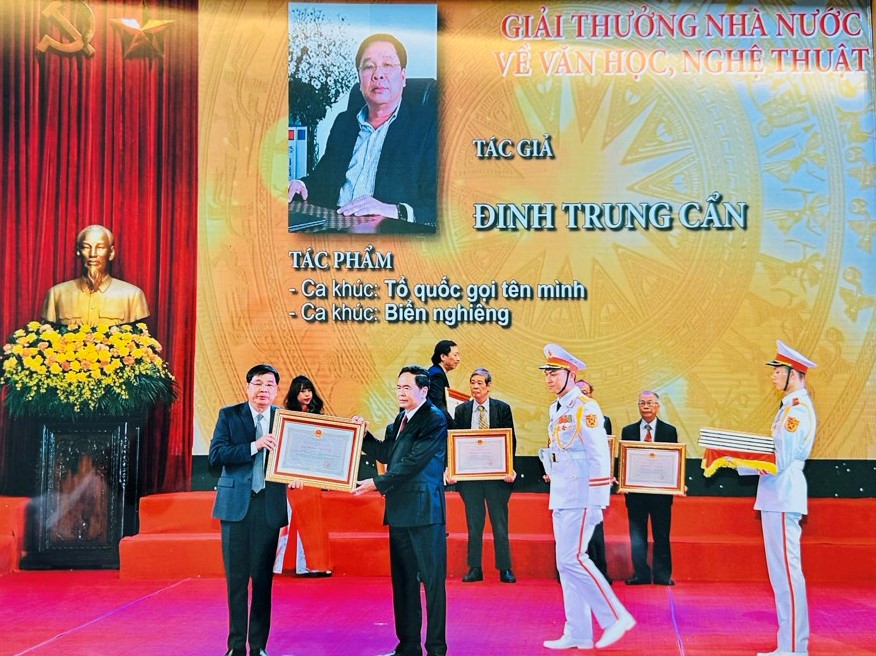 Phó Chủ tịch Thường trực Quốc hội - Trần Thanh Mẫn, trao Giải thưởng Nhà nước cho Nhạc sĩ Đinh Trung Cẩn - Tổng Giám đốc VCPMC với cụm tác phẩm: Tổ quốc gọi tên mình, Biển nghiêng