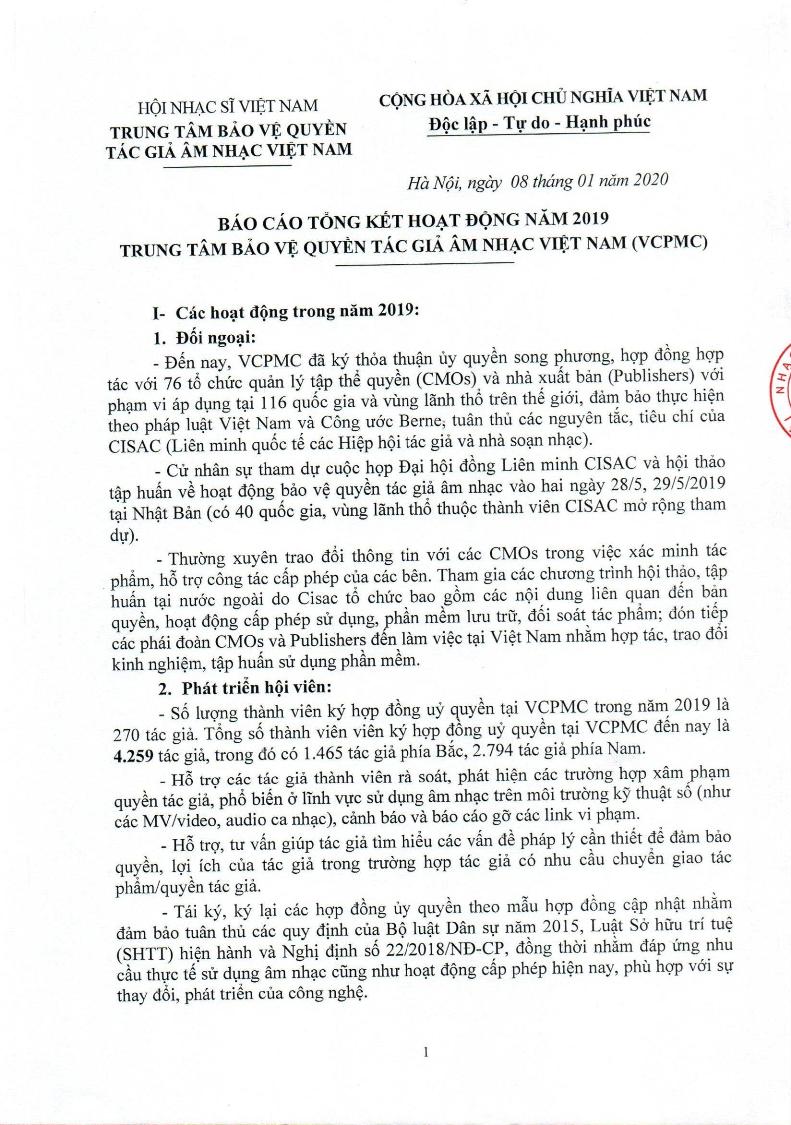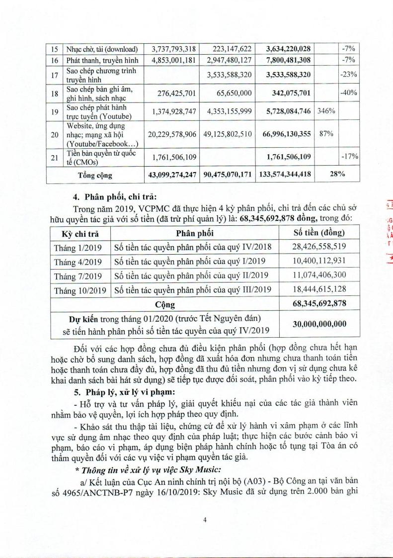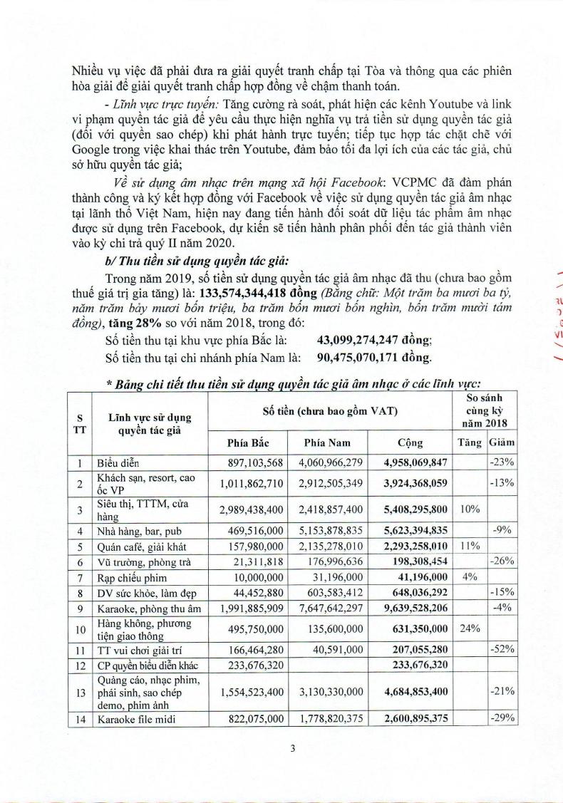 Trong năm 2019, số tiền sử dụng quyền tác giả âm nhạc đã thu chưa bao gồm thuế giá trị gia tăng là: 133,574,344,418 đồng Một trăm ba mươi ba tỷ, năm trăm bảy mươi bốn triệu, ba trăm bốn mươi bốn nghìn, bốn trăm mười tám đồng, tăng 28% so với năm 2018, trong đó: Số tiền thu tại khu vực phía Bắc là: 43,099,274,247 đồng; Số tiền thu tại chi nhánh phía Nam là: 90,475,070,171 đồng.