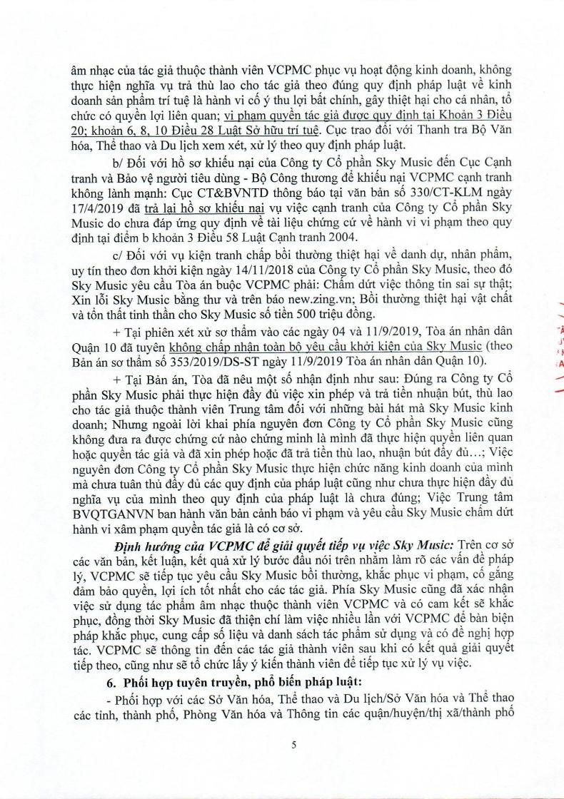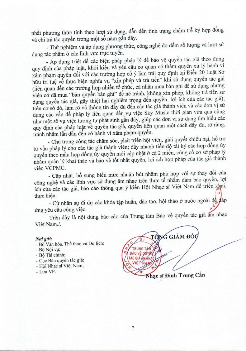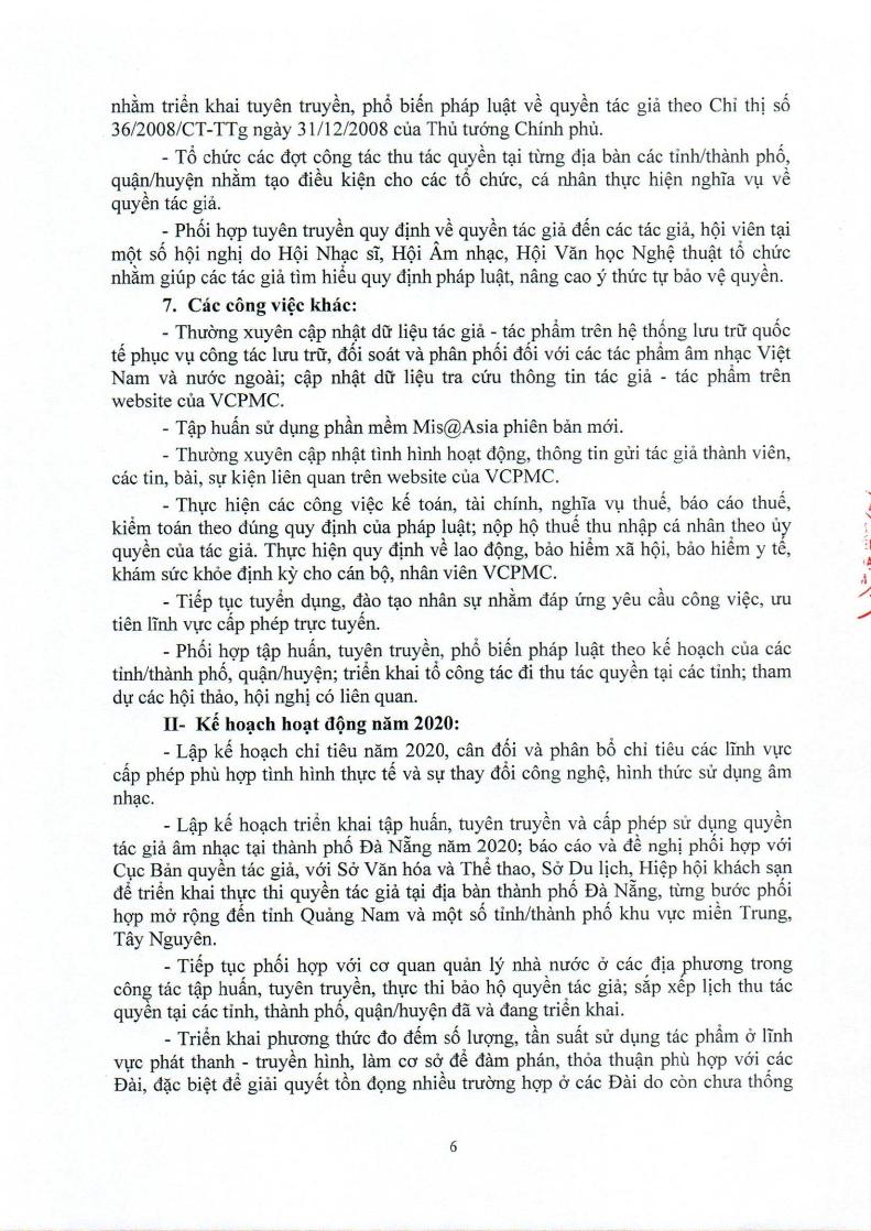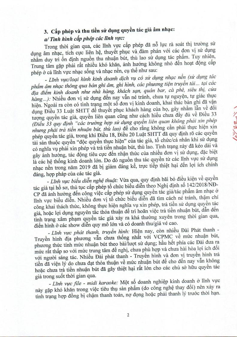 Trong năm 2019, số tiền sử dụng quyền tác giả âm nhạc đã thu chưa bao gồm thuế giá trị gia tăng là: 133,574,344,418 đồng Một trăm ba mươi ba tỷ, năm trăm bảy mươi bốn triệu, ba trăm bốn mươi bốn nghìn, bốn trăm mười tám đồng, tăng 28% so với năm 2018, trong đó: Số tiền thu tại khu vực phía Bắc là: 43,099,274,247 đồng; Số tiền thu tại chi nhánh phía Nam là: 90,475,070,171 đồng.