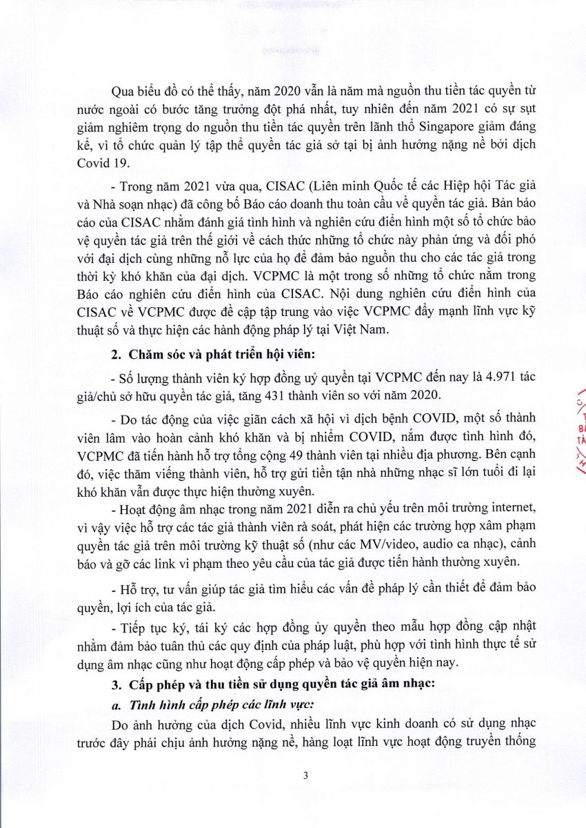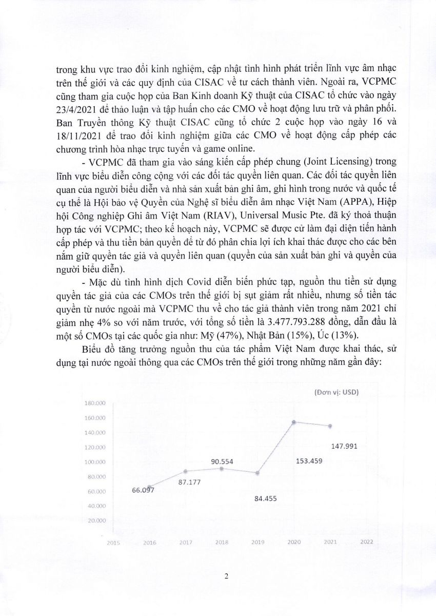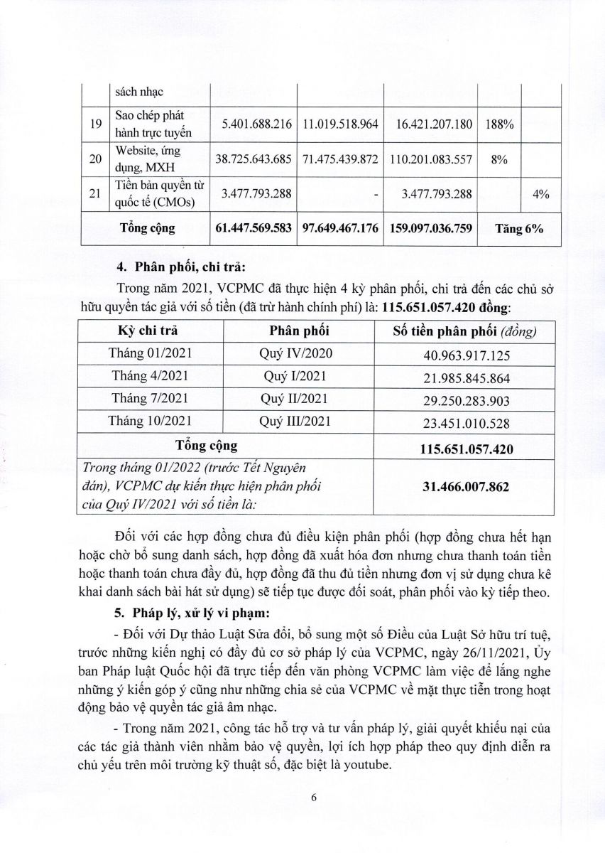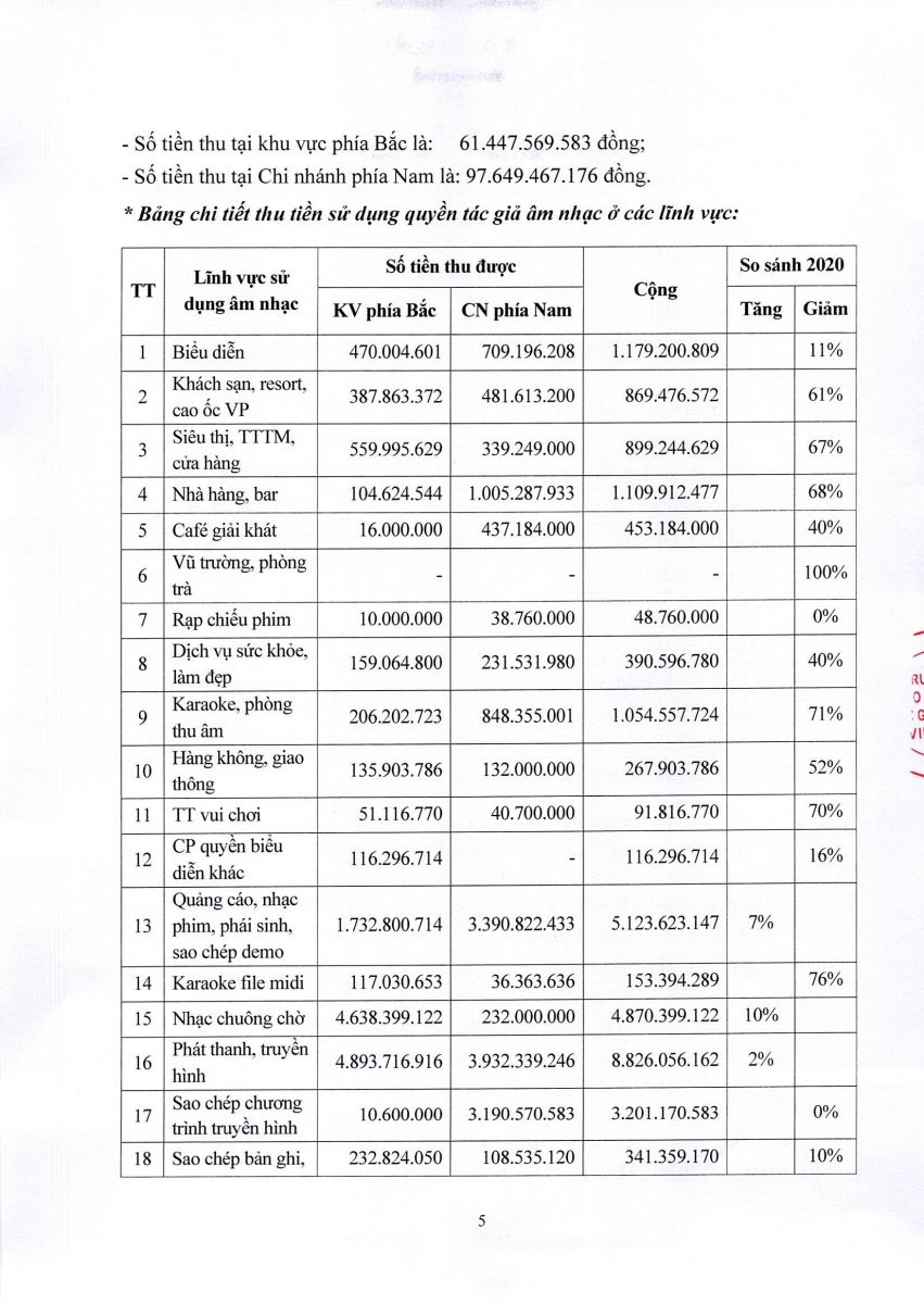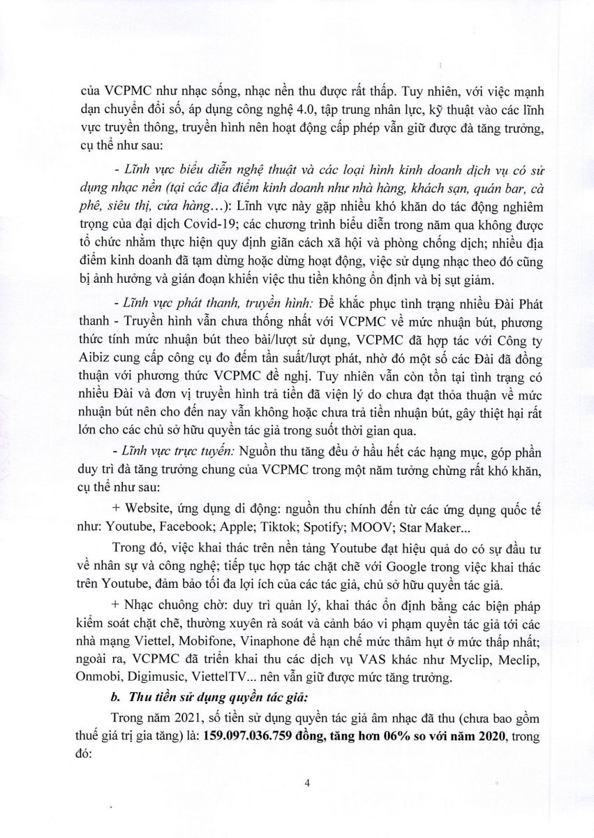Trong năm 2021, số tiền sử dụng quyền tác giả âm nhạc VCPMC đã thu chưa bao gồm thuế GTGT là: 159.097.036.759 đồng, tăng 0,6% so với năm 2020, trong đó:
