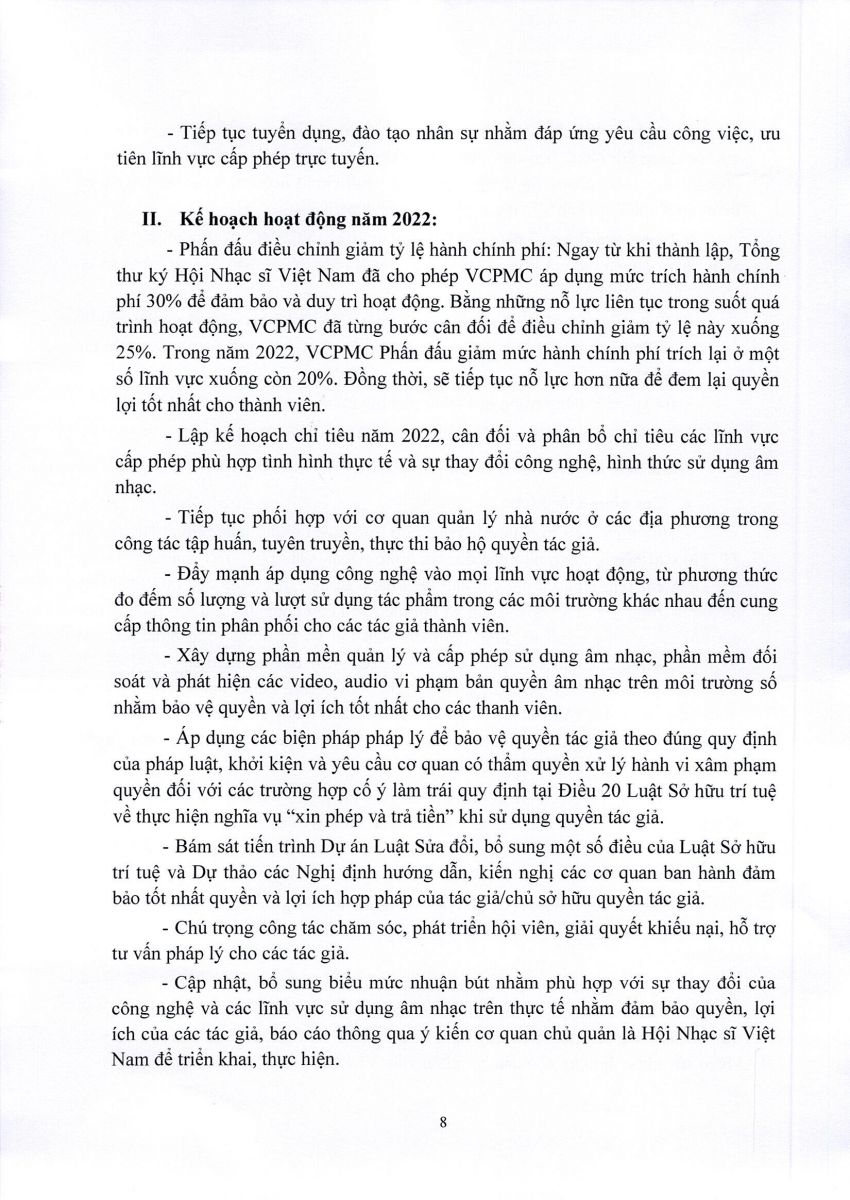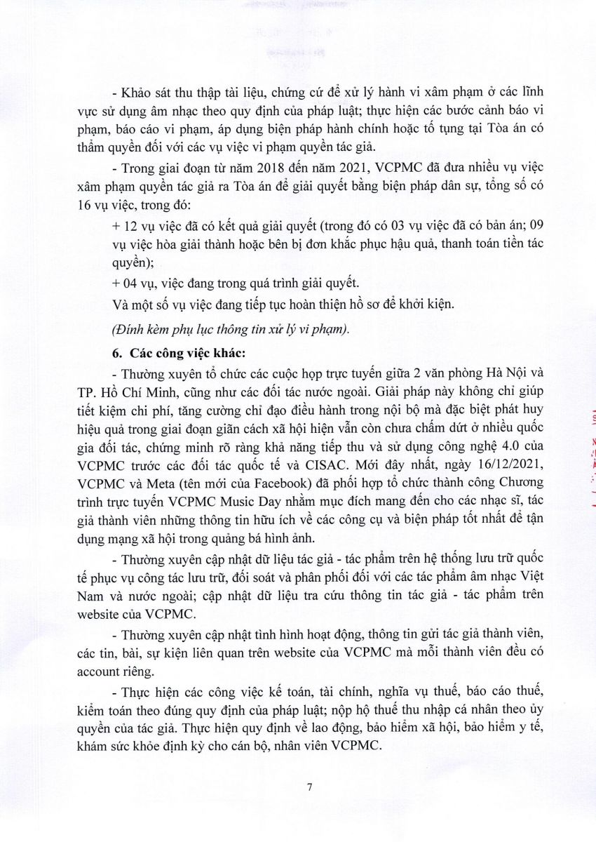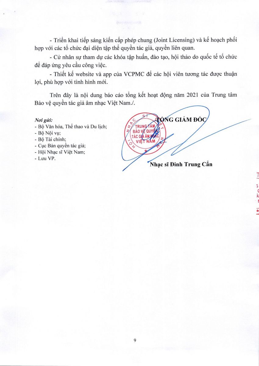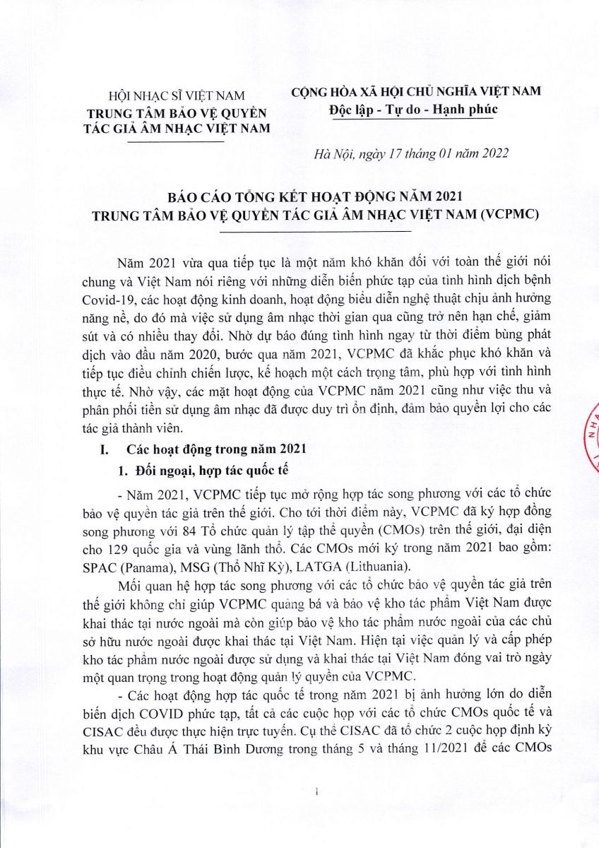 Trong năm 2021, số tiền sử dụng quyền tác giả âm nhạc VCPMC đã thu chưa bao gồm thuế GTGT là: 159.097.036.759 đồng, tăng 0,6% so với năm 2020, trong đó: