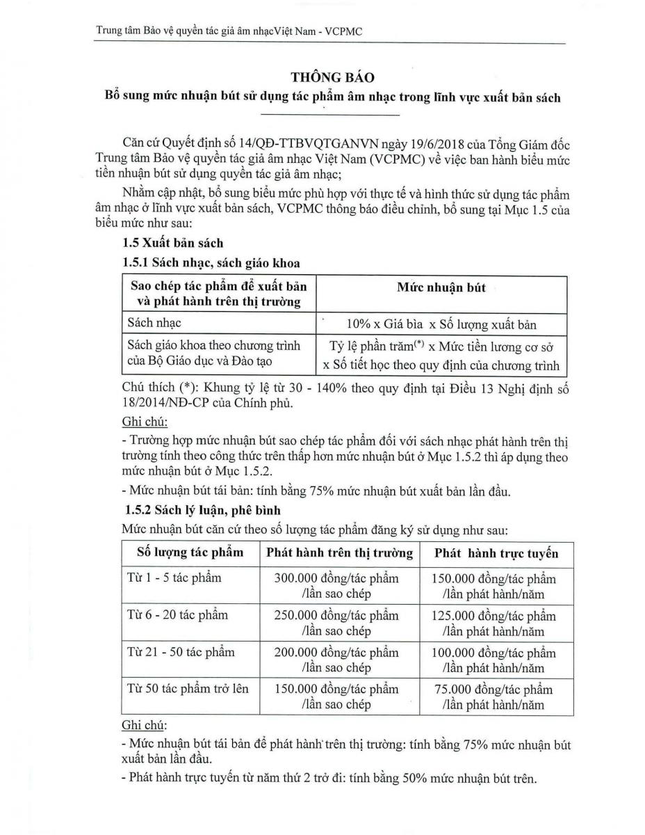 Biểu mức bổ sung sao chép sách nhạc 2019