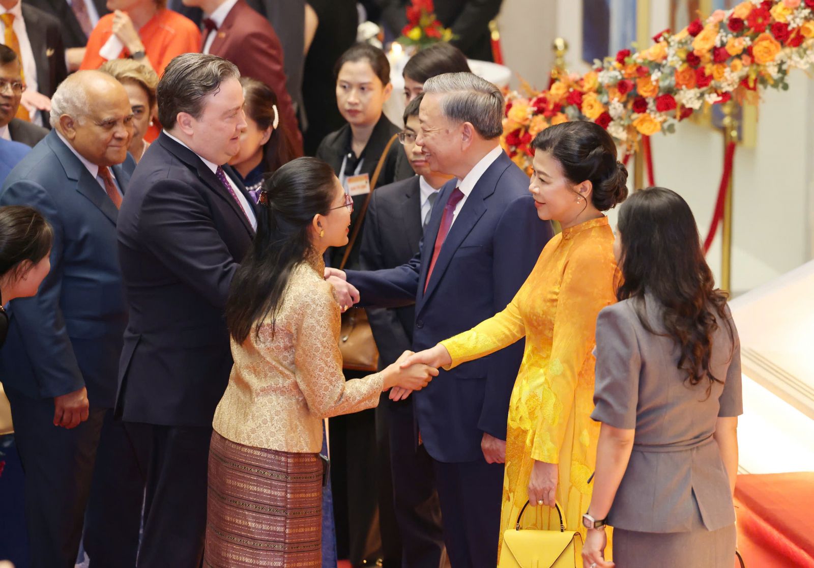 Tổng Bí thư Tô Lâm và Phu nhân đón các đại sứ, đại biện, trưởng đại diện các tổ chức quốc tế dự Lễ kỷ niệm 79 năm Ngày Quốc khánh 2.9. Ảnh: CTV