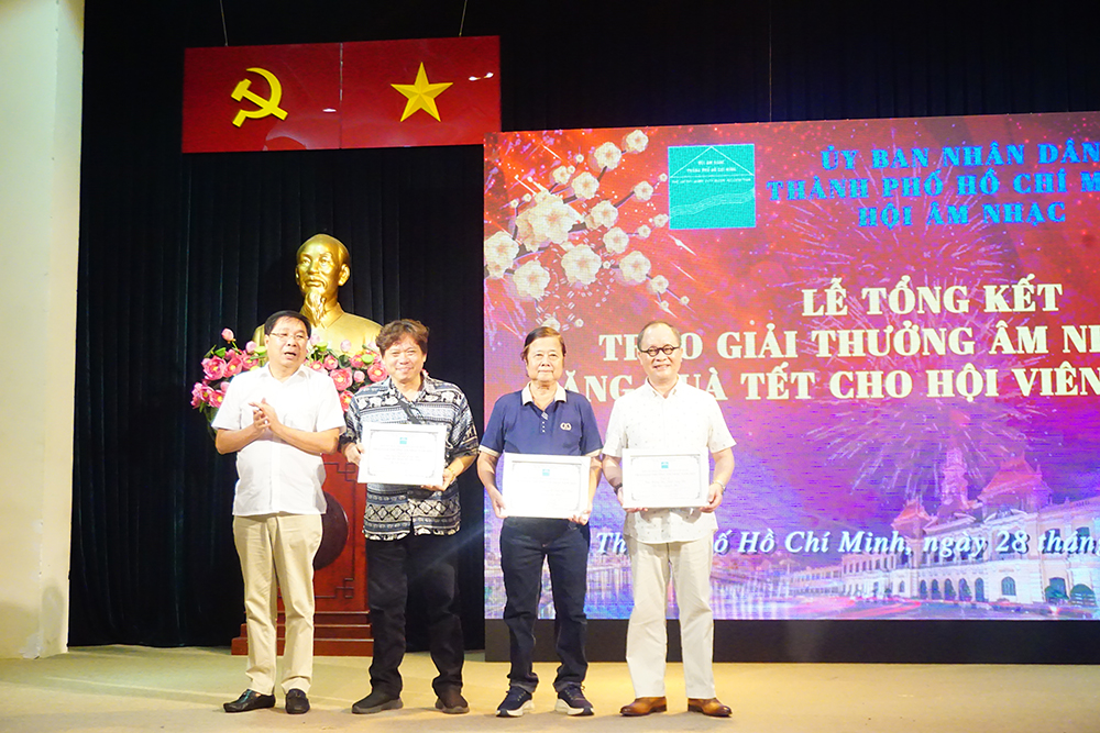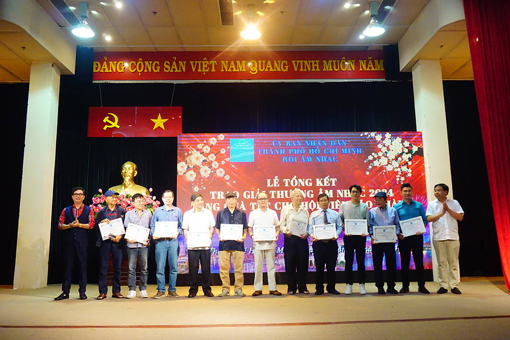 Hội Âm nhạc TP.HCM đã trao tổng công 28 Giải thưởng âm nhạc năm 2024 gồm: Thể loại ca khúc: 02 Giải A với tác phẩm Thành Phố Tôi Viết Tiếp Bài Ca Đi Tới sáng tác Huỳnh Lợi, TP. Hồ Chí Minh Rực Rỡ Những Mùa Xuân sáng tác Văn Thành Nho; 04 Giải B và 05 Giải C; Thể loại ca khúc Thiếu nhi, Tuổi hồng: 02 Giải A: Chúng Em Hát Trên Thành Phố Bác sáng tác Lê Vinh Phúc, Thấp Sáng Niềm Tin Vượt Khó Đến Trường sáng tác Trương Quang Lục;03 Giải B và 04 Giải C; Thể loại Khí nhạc, hợp xướng: 01 Giải A Hợp xướng:Linh Thiêng Tổ Quốc Việt Nam sáng tác Nguyễn Văn Hiên; 01 Giải B Giao hưởng thơ: Khát Vọng Phố sáng tác Nguyễn Hải, 01 Giải C Khí nhạc: sáo trúc và dàn nhạc: Thành Phố Rạng Ngời Mùa Xuân sáng tác Đinh Linh; Thể loại Công trình sách Nghiên cứu, lý luận, phê bình âm nhạc: 02 Giải A Giáo Trình Hát Dân Ca Dành Cho Đại Học Sư Phạm Âm Nhạc của PGS, TS, NGƯT Nguyễn Thị Mỹ Liêm, Công trình 300 Bài Hát Thiếu Nhi của Nhạc sĩ Nguyễn Văn Chung; 02 Giải B Tuyển tập 50 ca khúc Sử ca Hồng Bàng Đất Mẹ Văn Lang của Nhạc sĩ Phạm Đăng Khương, Tìm Hiểu Âm Nhạc Tài Tử Và Cải Lương (Vọng Cổ - Gita Phím Lõm) của Nhạc sĩ Kiều Tấn; 01 Giải C Tuyển tập 50 ca khúc Thiếu Nhi của Nhạc sĩ Lê Phúc.