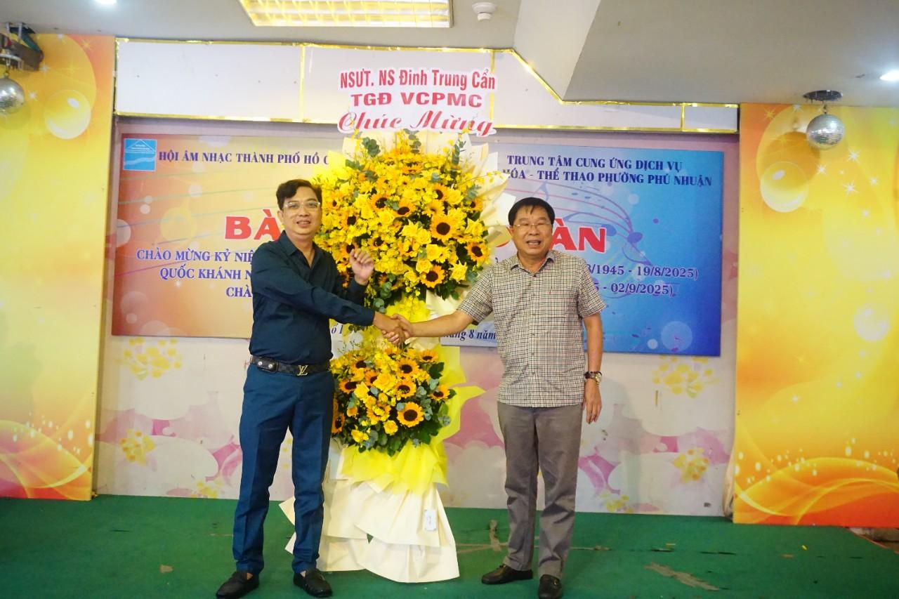 NSƯT, Nhạc sĩ Đinh Trung Cẩn - Tổng Giám đốc VCPMC tặng hoa, Thạc sĩ, Nhạc sĩ Nguyễn Quang Vinh - Chủ tịch Hội Âm nhạc TP.HCM nhận hoa chúc mừng.