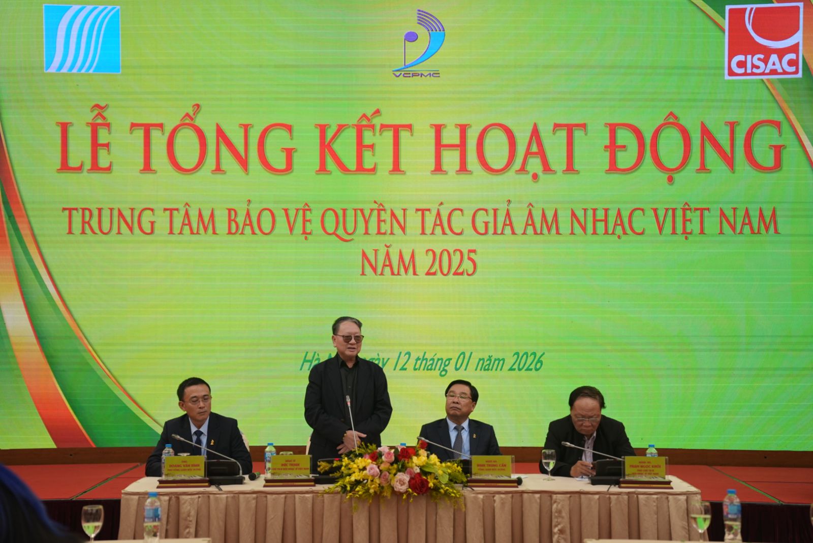Nhạc sĩ Đinh Trung Cẩn – Tổng Giám đốc Trung tâm Bảo vệ quyền tác giả âm nhạc Việt Nam chia sẻ thông tin tại lễ tổng kết. Ảnh: VCPMC