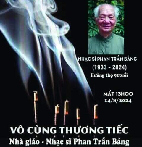 Trung tâm Bảo vệ quyền tác giả âm nhạc Việt Nam vô cùng thương tiếc báo tin: Nhạc sĩ - Nhà giáo Phan Trần Bảng đã từ trần vào ngày 14/8 tại Hà Nội, hưởng thọ 91 tuổi.