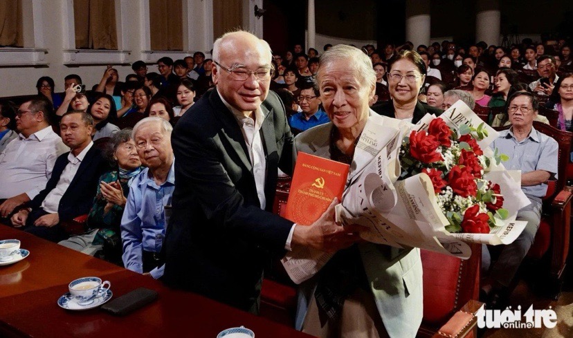 Ông Phan Nguyễn Như Khuê - trưởng Ban Tuyên giáo Thành ủy TP.HCM - tặng hoa nhạc sĩ Trần Long Ẩn - Ảnh: T.T.D.