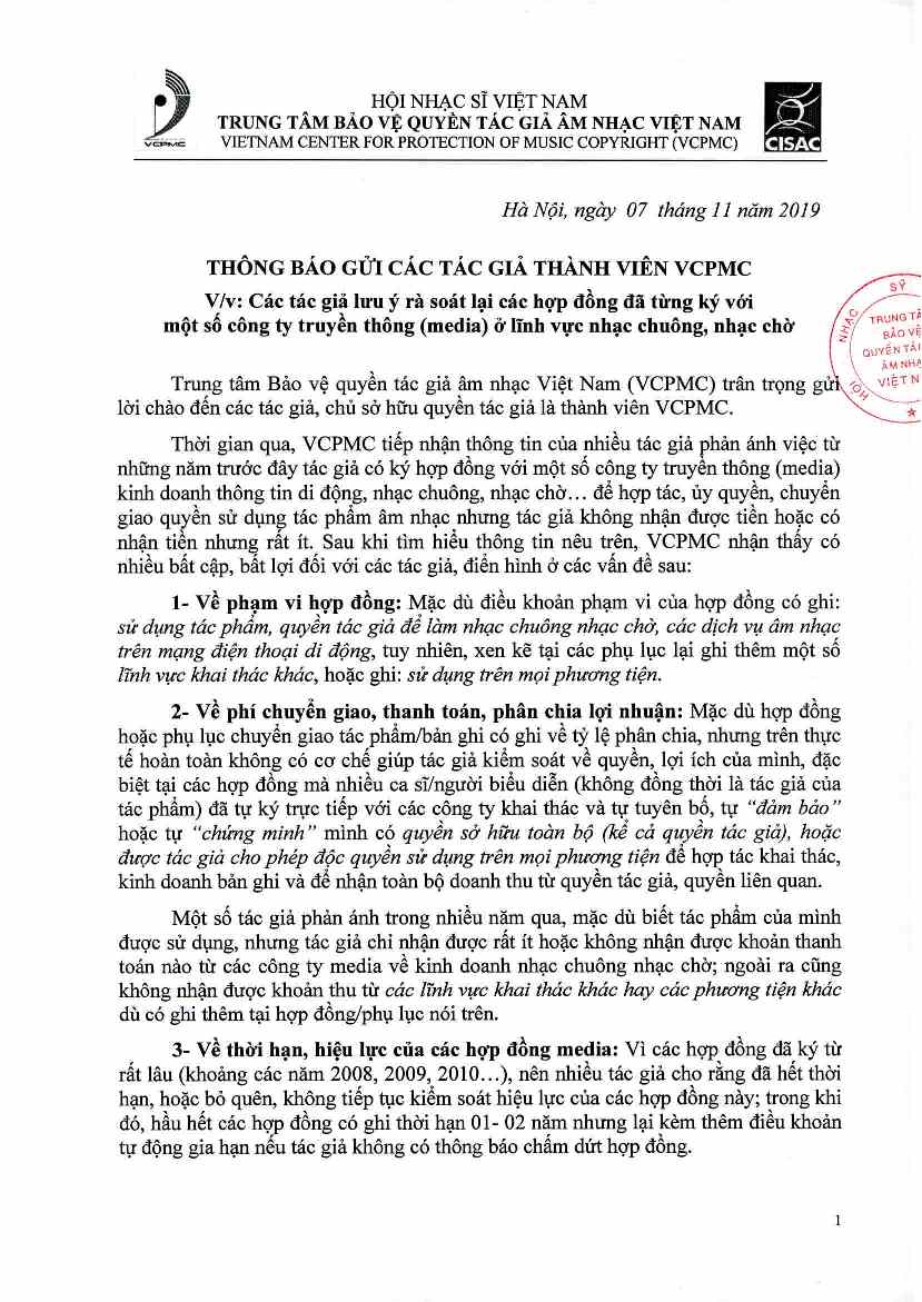 Thời gian qua, VCPMC tiếp nhận thông tin của nhiều tác giả phản ánh việc từ những năm trước đây tác giả có ký hợp đồng với một số công ty truyền thông media kinh doanh thông tin di động, nhạc chuông, nhạc chờ… để hợp tác, ủy quyền, chuyển giao quyền sử dụng tác phẩm âm nhạc nhưng tác giả không nhận được tiền hoặc có nhận tiền nhưng rất ít. Sau khi tìm hiểu thông tin nêu trên, VCPMC nhận thấy có nhiều bất cập, bất lợi đối với các tác giả.