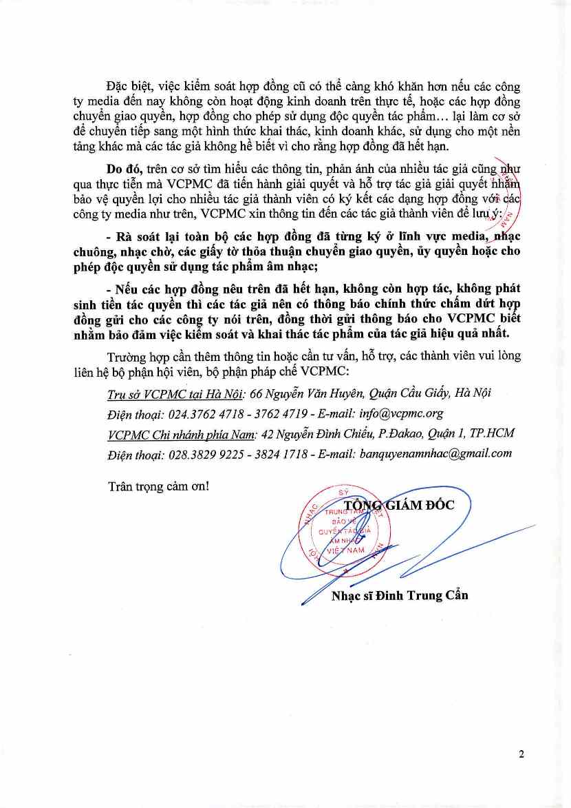 - Nếu các hợp đồng nêu trên đã hết hạn, không còn hợp tác, không phát sinh tiền tác quyền thì các tác giả nên có thông báo chính thức chấm dứt hợp đồng gửi cho các công ty nói trên, đồng thời gửi thông báo cho VCPMC biết nhằm bảo đảm việc kiểm soát và khai thác tác phẩm của tác giả hiệu quả nhất.