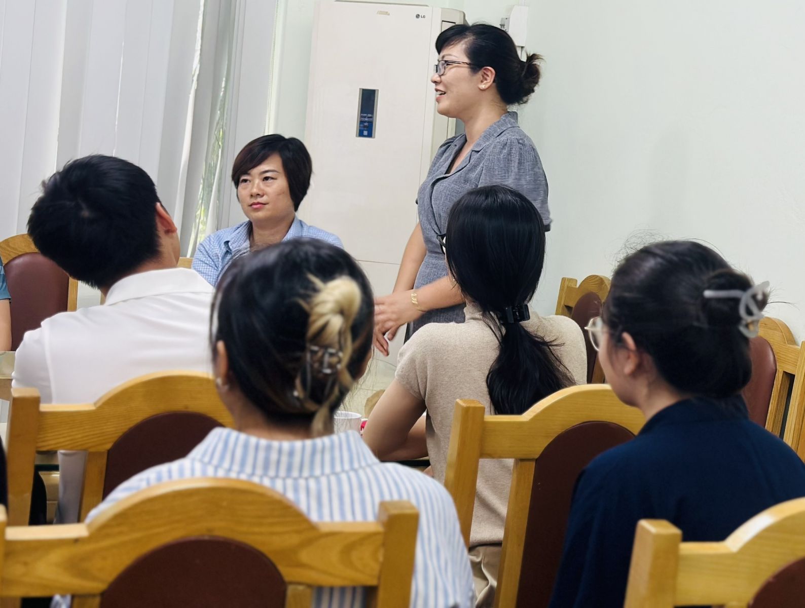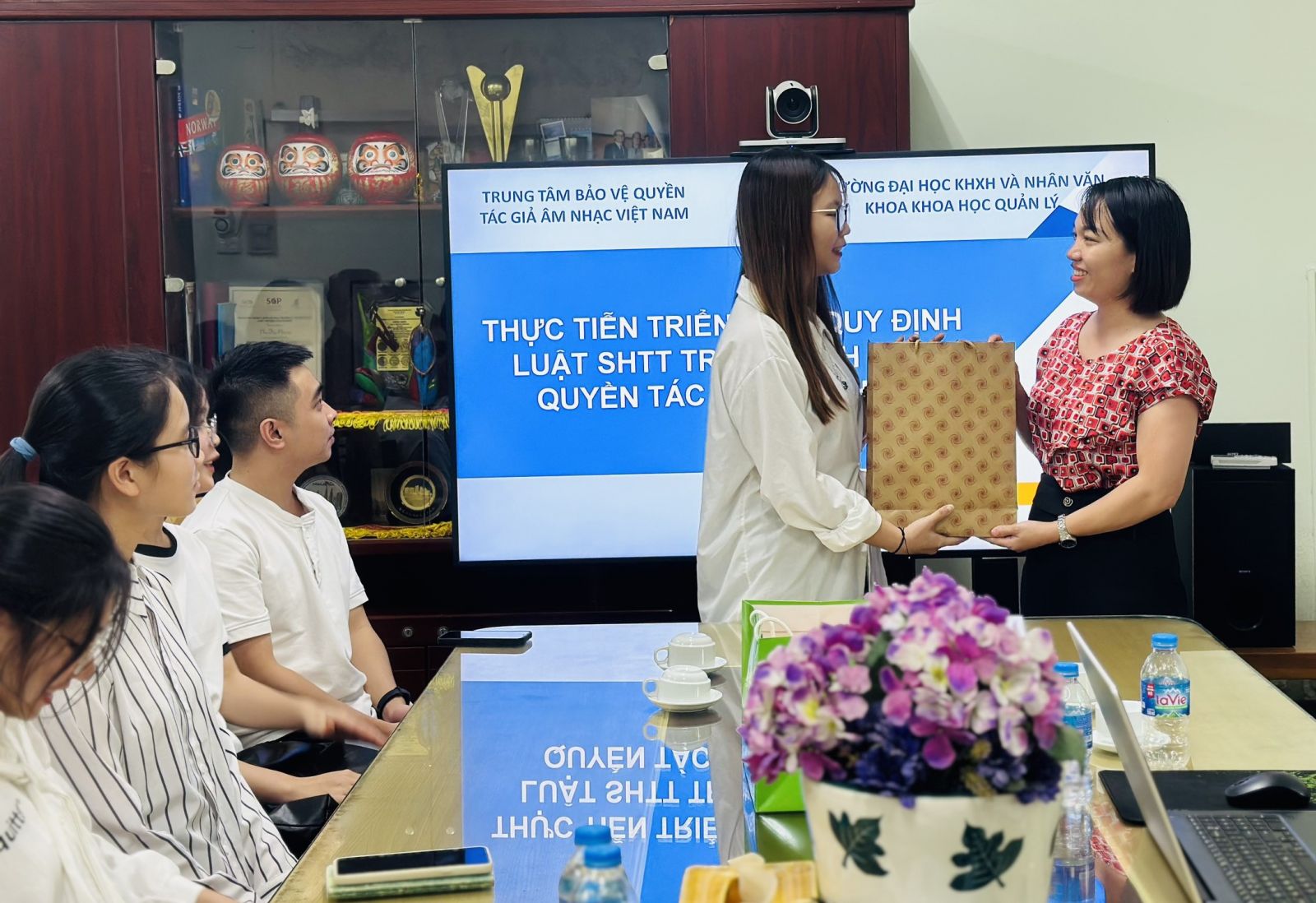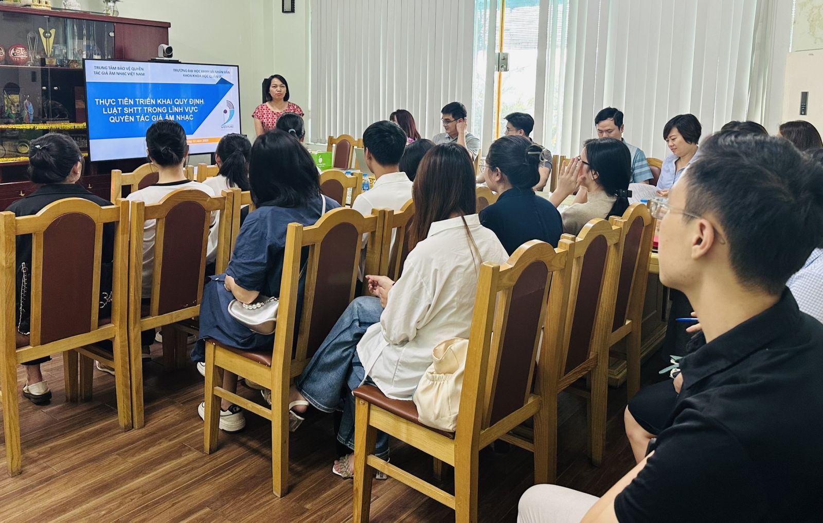 Buổi trao đổi, chia sẻ “Thực tế triển khai quy định Luật Sở hữu trí tuệ trong lĩnh vực quyền tác giả âm nhạc” có đại diện Trung tâm Bảo vệ quyền tác giả âm nhạc VIệt Nam; Tiến sĩ Hoàng Thị Hải Yến - giảng viên Trường Đại học Khoa học xã hội và Nhân văn, Đại học Quốc gia Hà Nội; Thạc sĩ Vũ Thị Cẩm Thanh (giảng viên) và các sinh viên.