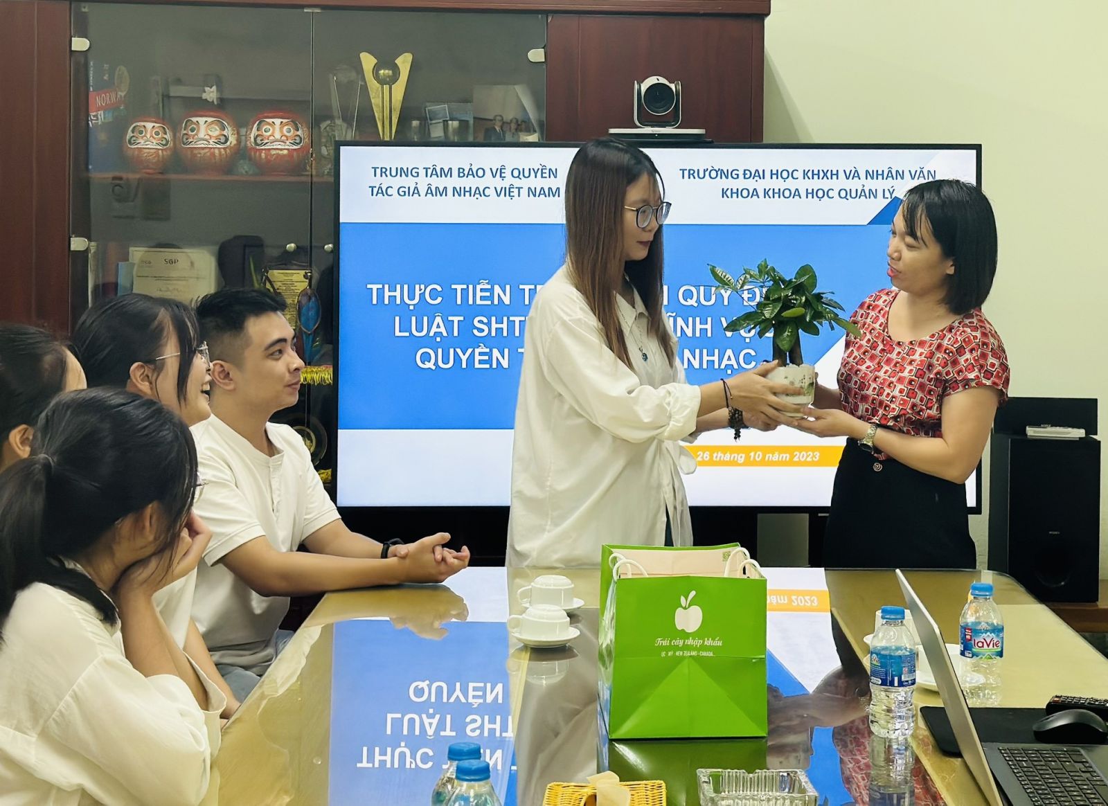 Ngày 26/10/2023, Trung tâm Bảo vệ quyền tác giả âm nhạc VIệt Nam có buổi trao đổi, chia sẻ “Thực tế triển khai quy định Luật Sở hữu trí tuệ trong lĩnh vực quyền tác giả âm nhạc” cho nhóm sinh viên chuyên ngành Sở hữu trí tuệ thuộc Khoa Khoa học quản lý – Trường Đại học Khoa học xã hội và Nhân văn, Đại học Quốc gia Hà Nội.