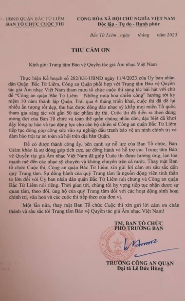• Thư cảm ơn của Công an Quận Bắc Từ Liêm
