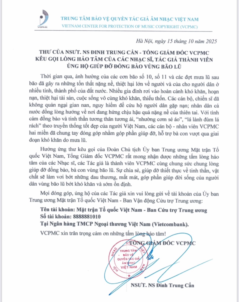 Bên cạnh đó, NSƯT. Nhạc sĩ Đinh Trung Cẩn, Tổng Giám dốc Trung tâm Bảo vệ Quyền tác giả âm nhạc Việt Nam cũng đã gửi thư tới các nhạc sĩ - tác giả thành viên của VCPMC. Trong thư viết: Thời gian qua, ảnh hưởng của các cơn bão số 10, số 11 và các đợt mưa lũ sau bão đã gây ra những tổn thất nặng nề, thiệt hại lớn về người và của cho người dân ở nhiều tỉnh, thành phố của đất nước. Nhiều gia đình rơi vào hoàn cảnh khó khăn, hoạn nạn, thiệt hại tài sản, cuộc sống vô cùng khó khăn, thiếu thốn. Các cán bộ, chiến sĩ đã không quản ngại gian nan, nguy hiểm để cứu hộ người dân gặp nạn; nhân dân cả nước đồng lòng hướng về nơi đang hứng chịu hậu quả nặng nề của thiên tại. Với tình cảm đồng bào và tinh thần tương thân tương ái, “nhường cơm sẻ áo”, “lá lành đùm lá rách” theo truyền thống tốt đẹp của người Việt Nam, các cán bộ - nhân viên VCPMC hai miền đã chung tay đóng góp nhằm góp phần giúp đỡ, hỗ trợ bà con vượt qua giai đoạn khó khăn do mưa lũ. Hưởng ứng thư kêu gọi của Đoàn Chủ tịch Ủy ban Trung ương Mặt trận Tổ quốc Việt Nam, Tổng Giám đốc VCPMC rất mong nhận được những tấm lòng hảo tâm của các Nhạc sĩ, các Tác giả là thành viên VCPMC cùng chung sức chung lòng giúp đỡ đồng bào, bà con vùng bão lũ. Sự chia sẻ, giúp đỡ thiết thực về tinh thần, vật chất sẽ làm vơi bớt những đau thương, mất mát, góp phần giúp đời sống của người dân vùng bão lũ bớt khó khăn và sớm ổn định.