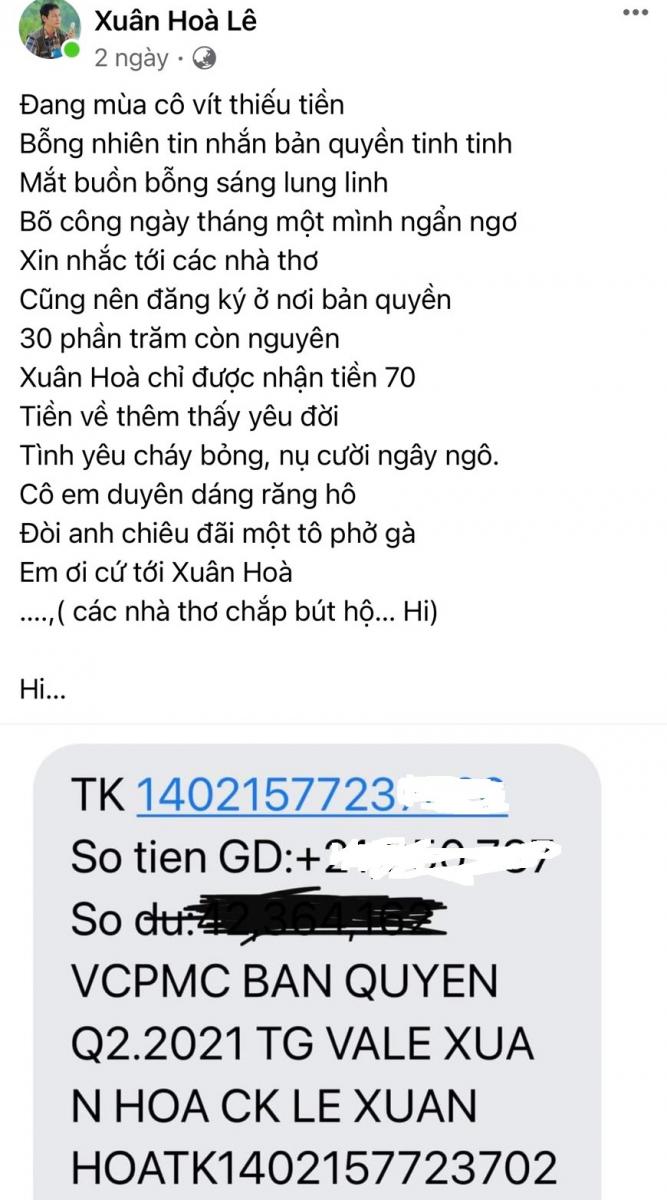 Trên trang cá nhân của mình, nhạc sĩ Lê Xuân Hòa Nghệ An, phấn khích khi nhận được tin vui qua tin nhắn tài khoản, anh đã ngẫu hứng mấy câu thơ: “Đang mùa cô vít thiếu tiền/Bỗng nhiên tin nhắn bản quyền tinh tinh/Mắt buồn bỗng sáng lung linh/ Bõ công ngày tháng một mình ngẩn ngơ/ Xin nhắc tới các nhà thơ/ Cũng nên đăng ký ở nơi bản quyền/ 30 phần trăm còn nguyên/ Xuân Hoà chỉ được nhận tiền 70/ Tiền về thêm thấy yêu đời/Tình yêu cháy bỏng, nụ cười ngây ngô…”