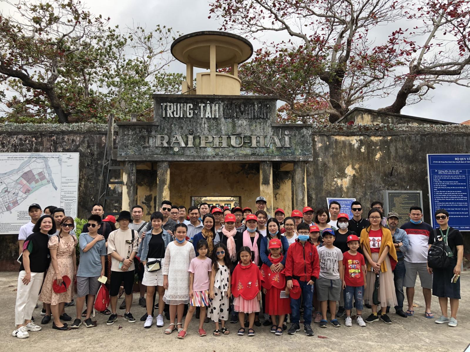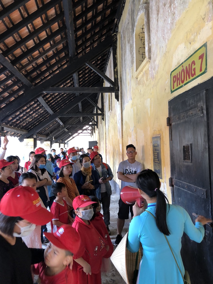 Các thành viên trong đoàn chăm chú nghe hướng dẫn viên Khu Di tích lịch sử Nhà tù Côn Đảo nói về quá trình hình thành hệ thống nhà tù và những đòn tra tấn man dợ của thực dân, đế quốc.