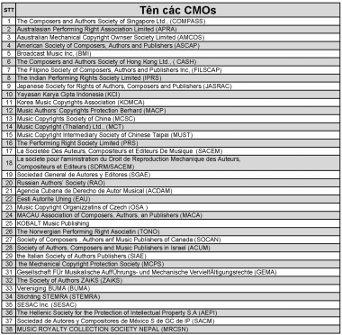 Danh sách các tổ chức mà VCPMC ký hợp đồng hợp tác song phương: