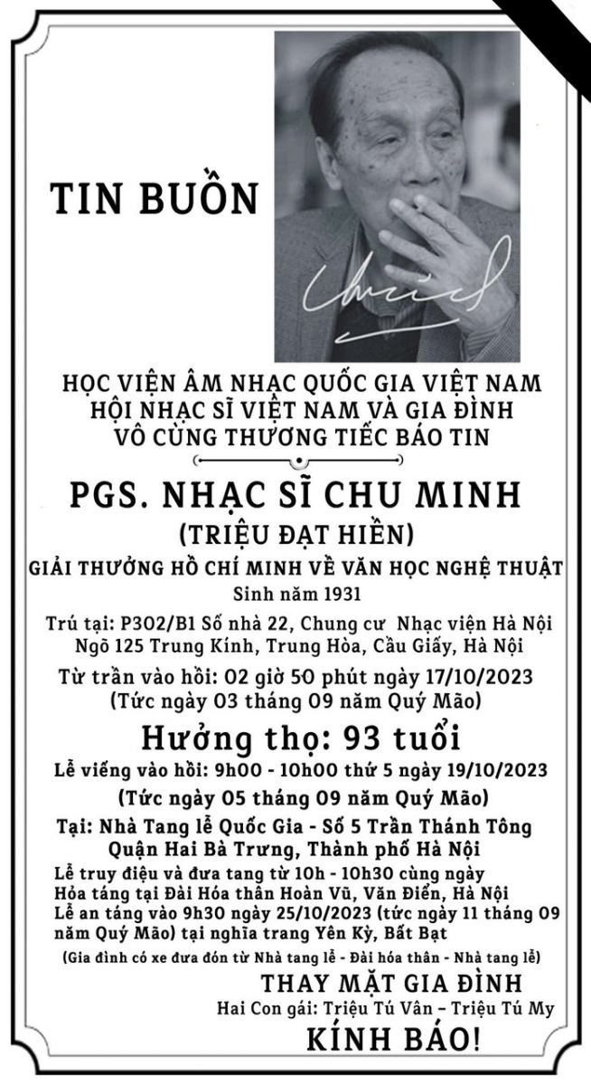Học viện Âm nhạc Quốc gia Việt Nam; Hội Nhạc sĩ Việt Nam; Trung tâm Bảo vệ quyền tác giả âm nhạc Việt Nam vô cùng thương tiếc báo Lễ viếng nhạc sĩ Chu MInh được tổ chức vào hồi 90h-10h ngày 19/10/2023 ( tức ngày 5/09 Quý Mão) tại Nhà Tang lễ Quốc gia, số 5 Trần Thánh Tông, Hà Nội.