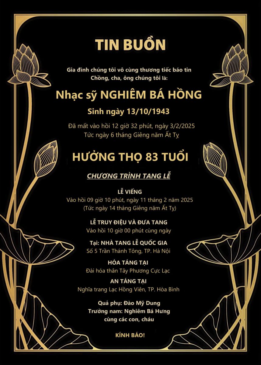 Theo thông tin từ gia đình, Tang lễ nhạc sĩ Nghiêm Bá Hồng sẽ được tổ chức vào hồi 9 giờ 10 phút ngày 11/2/2025 tại Nhà Tang lễ Quốc gia, số 5 Trần Thánh Tông, Hà Nội. An táng tại Nghĩa trang Lạc Hồng Viên, Hoà Bình.